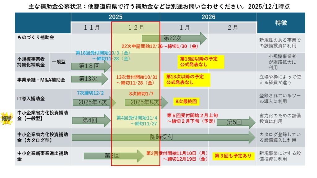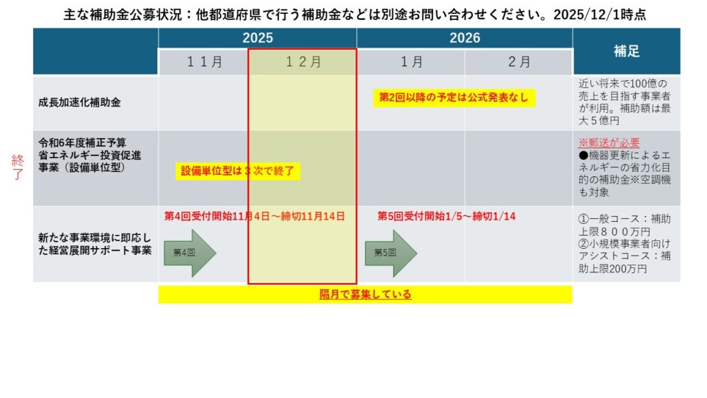 お世話になります。12月1日時点の補助金公募状況をご案内いたします。