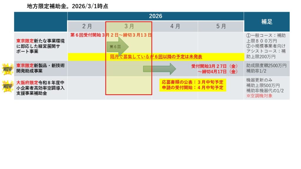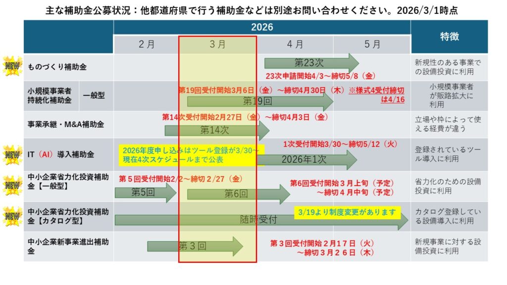 お世話になります。2026年3月1日時点の補助金公募状況をご案内いたします。